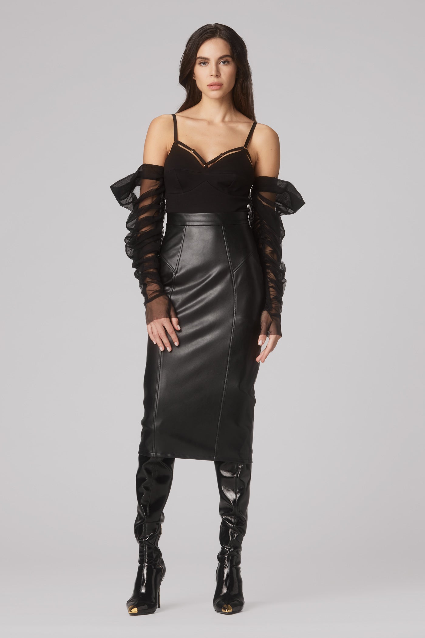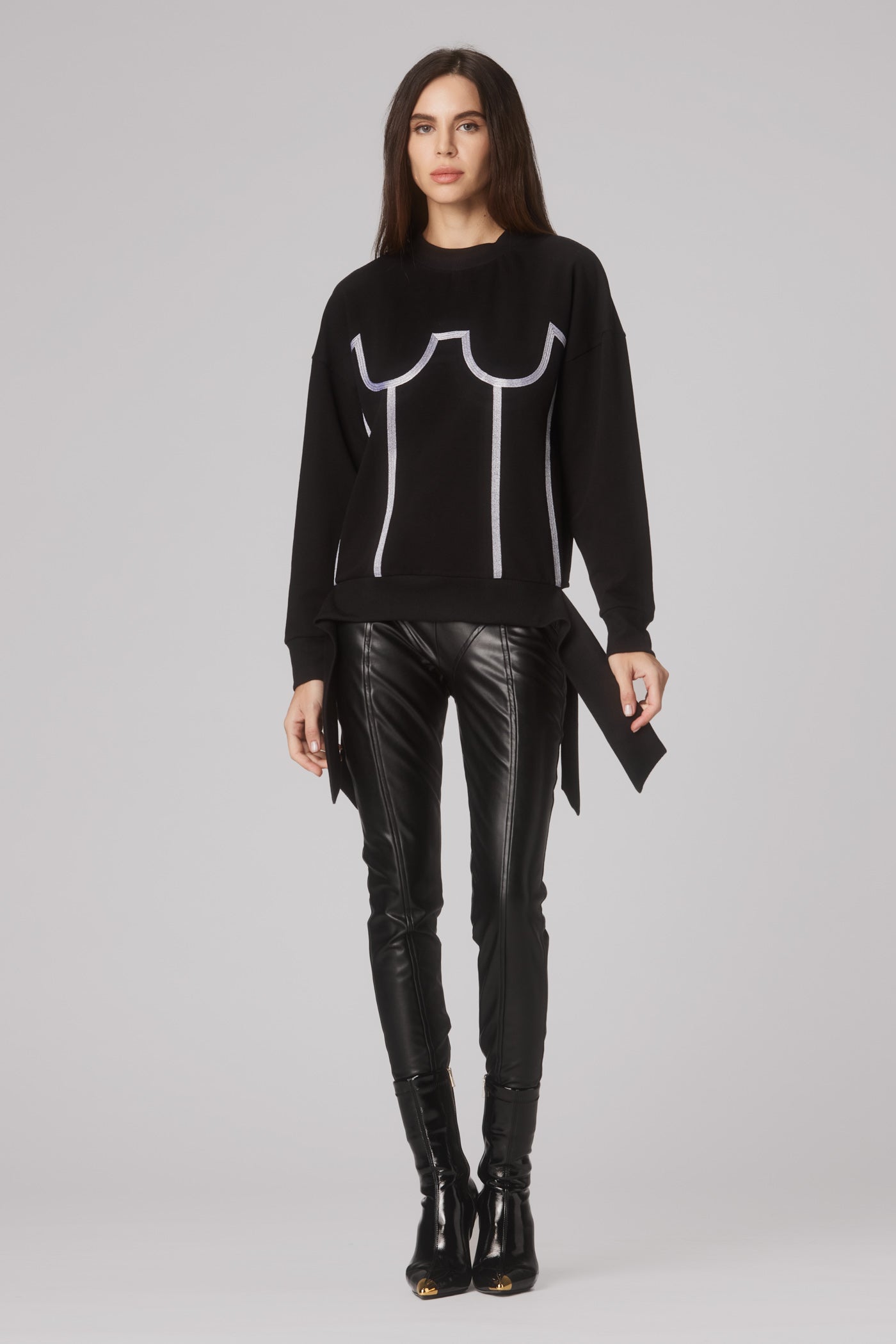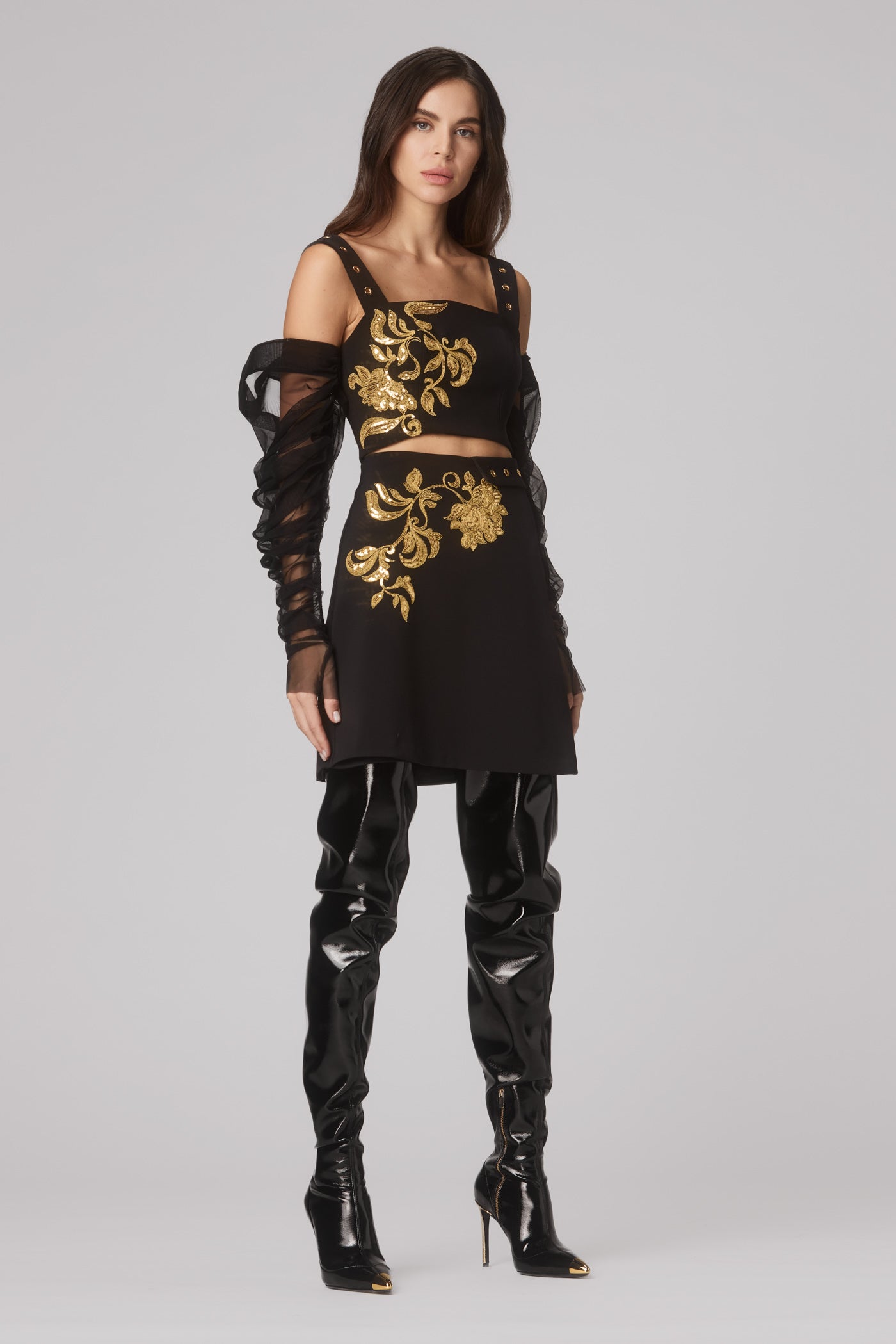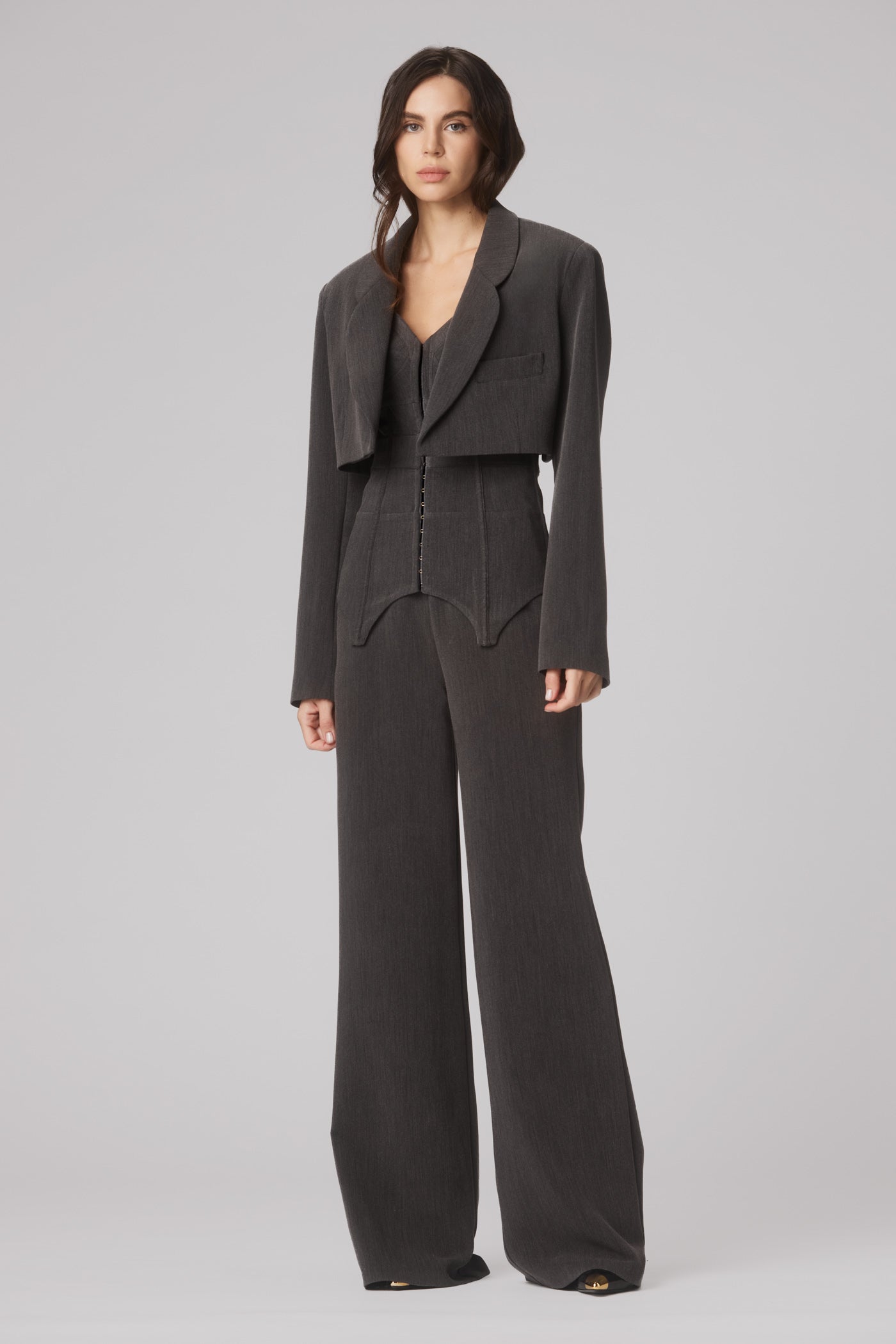 Masculine-inspired silhouettes reimagined through corsetry, floral cut-outs, and rich textures - from Italian vegan leather to delicate embroidery.