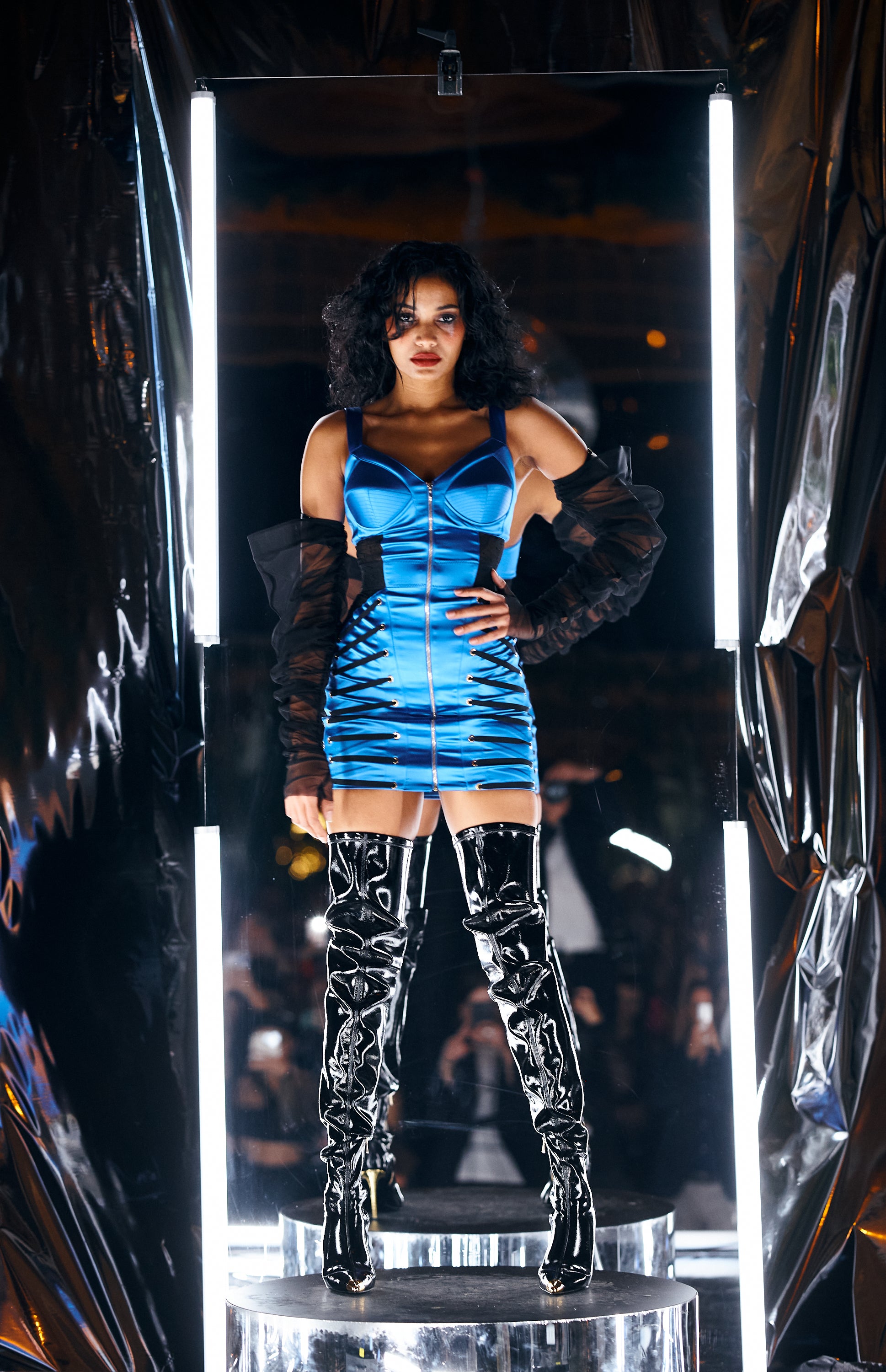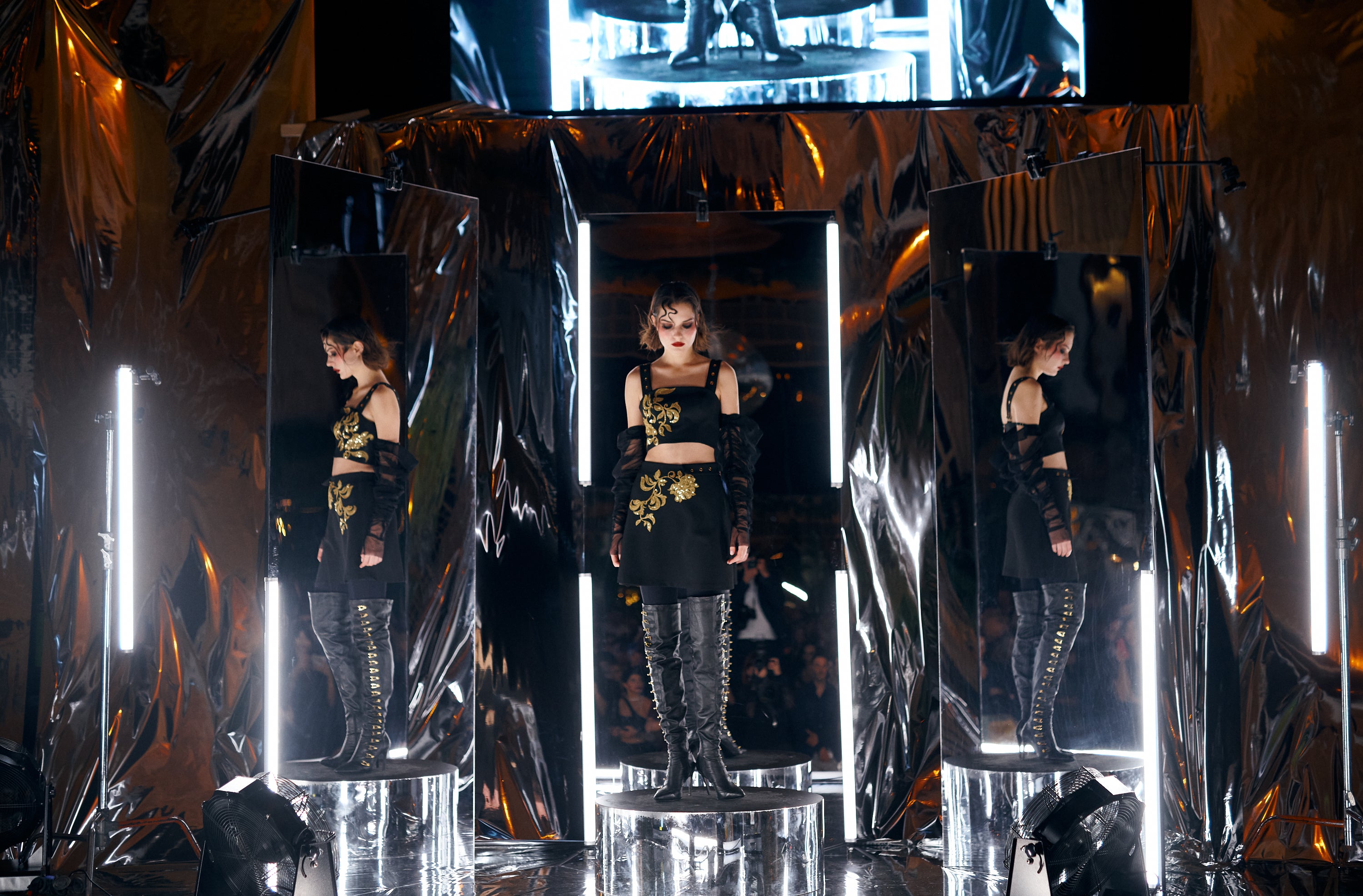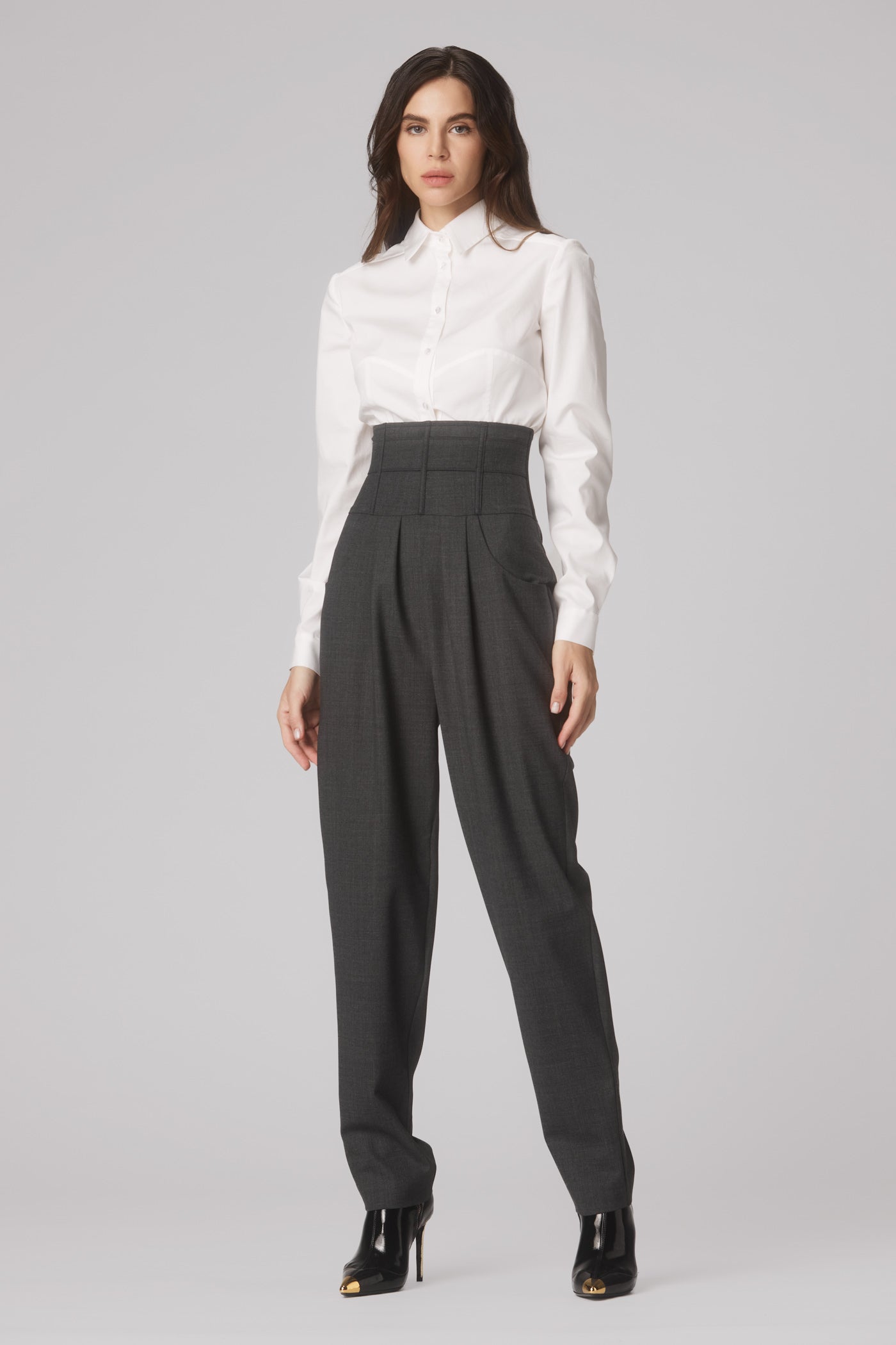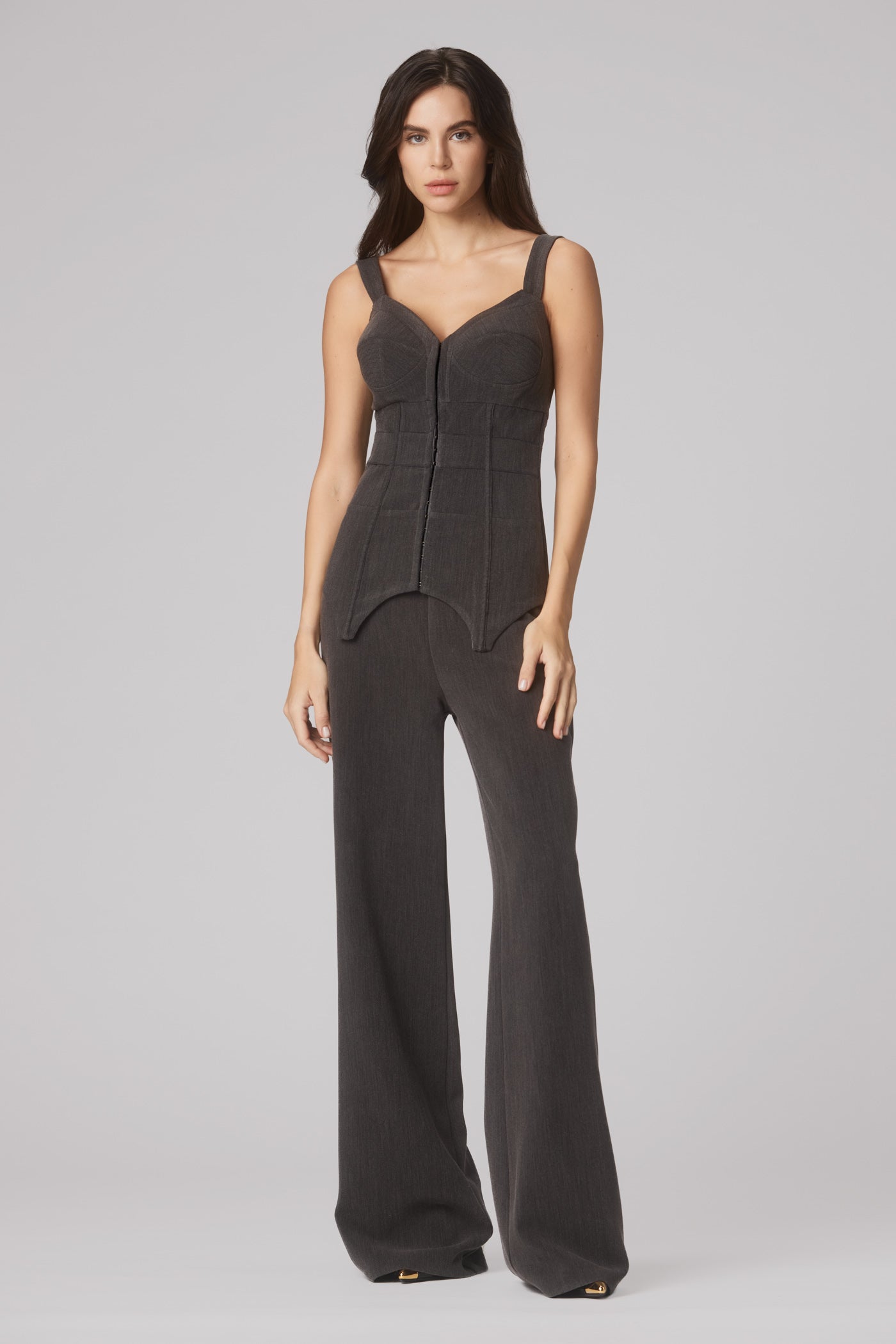 Masculine-inspired silhouettes reimagined through corsetry, floral cut-outs, and rich textures - from Italian vegan leather to delicate embroidery.